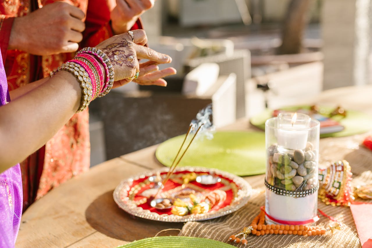 Indian altars are built around statues or pictures of deities, adorned with garlands, oil lamps (diyas), offering plates (pooja thali) and altar cloths (vastra), spiced up with incense (agarbatti), sacred pastes and powders, and colour to attract positive energy.