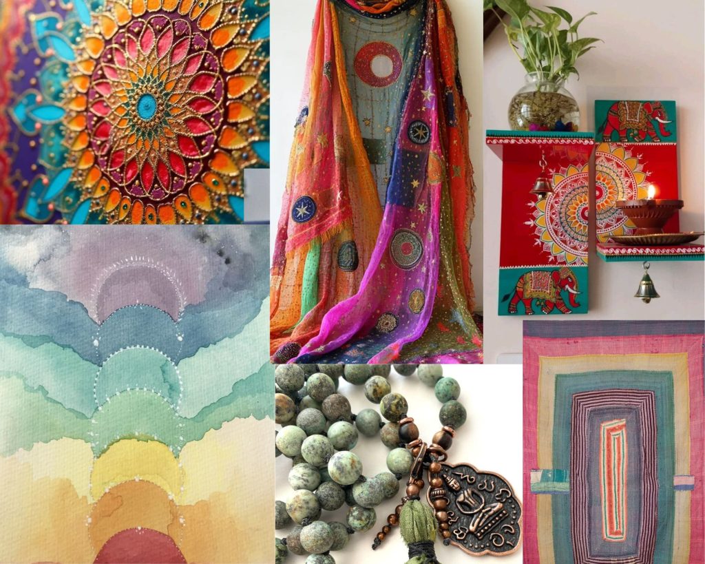 Mandalas, colourful kantha blankets, chakra / deity paintings, mala beads, meditation cushions (zafus), robes, diyas, spiritual quotes and vision boards, Indian altars provide a wide space to express your devotion and purpose.